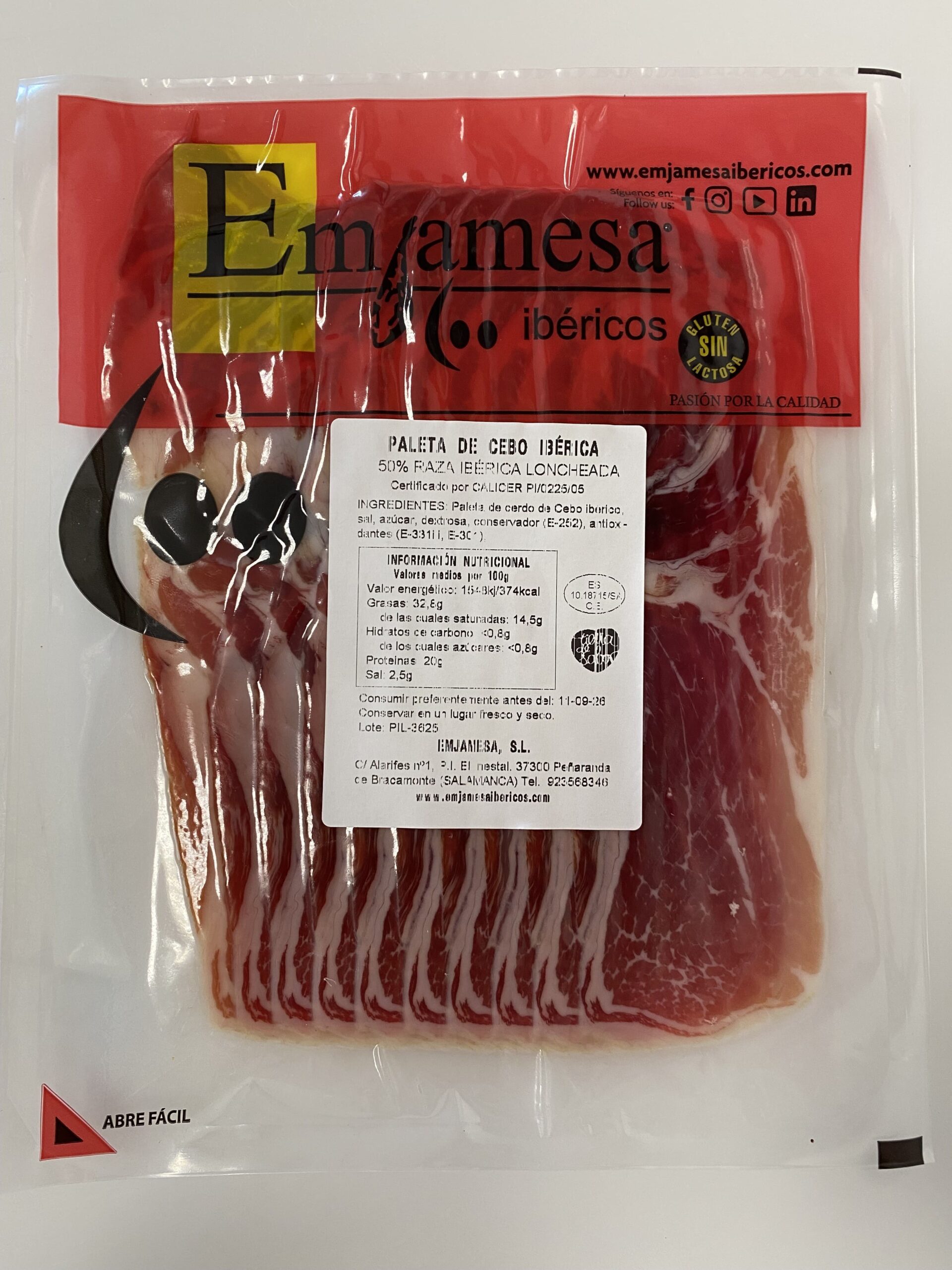 Ingredientes: Paleta de cerdo de cebo ibérico, sal, azúcar, conservadores (E-250 y E-252) y antioxidante (E-331 iii)